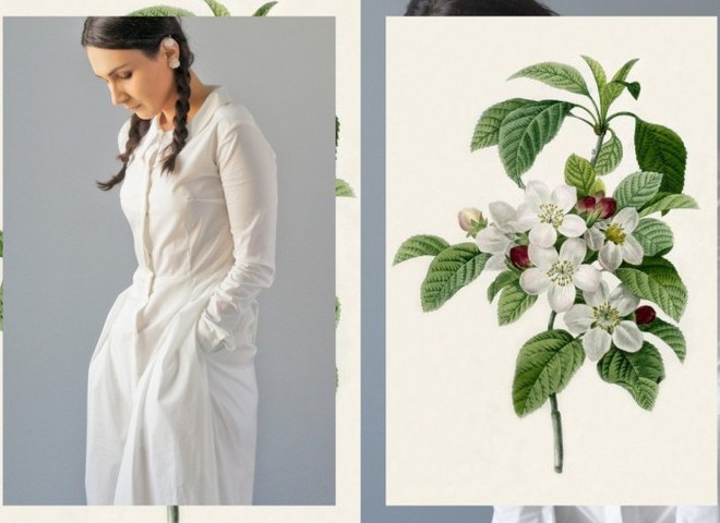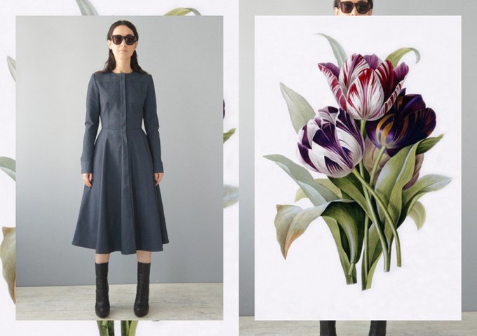 Несмотря на то, что сама коллекция весьма лаконична и, местами, мрачновата, съемка вышла очень легкой и романтичной. Коллажи из фотографий Каши и иллюстраций весенних цветов совершенно по-новому интерпритируют коллекцию и, признаемся, просто радуют глаз.
