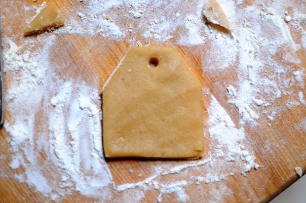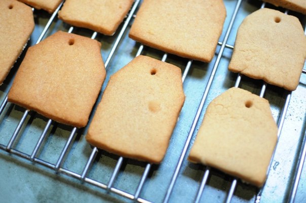 Вырежи печенье по форме чайного пакетика. Сделай отверстие для ниточки, переложи на противень и выпекай при 150 градусах около 20 минут до золотисто-коричневого цвета.