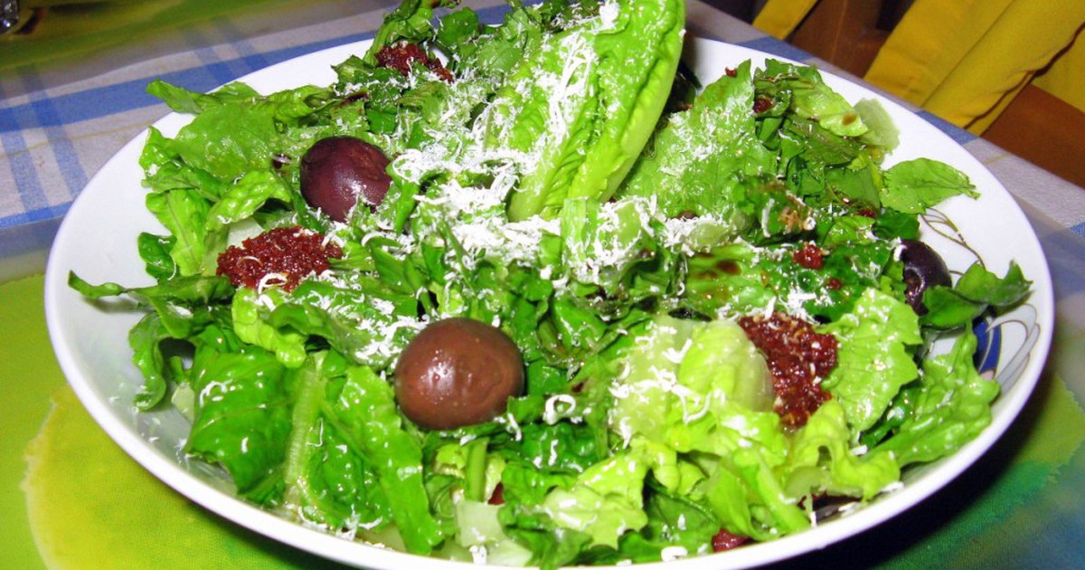 - Посыпать салат сверху тертым пармезаном. Салат готов! Приятного аппетита!