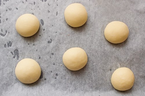 Смешай все ингредиенты до получения мягкого, слегка липкого теста. Разделай его на 15 частей (по 50гр), скатай в шарики, слегка прижми рукой и оставь на расстойку на 1 час.