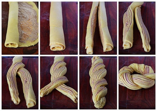 Скрученный рулет разрежь пополам вдоль, оставляя неразрезанным кончик. Переплети две половинки и соедини концы, чтобы получился замкнутый круг.
