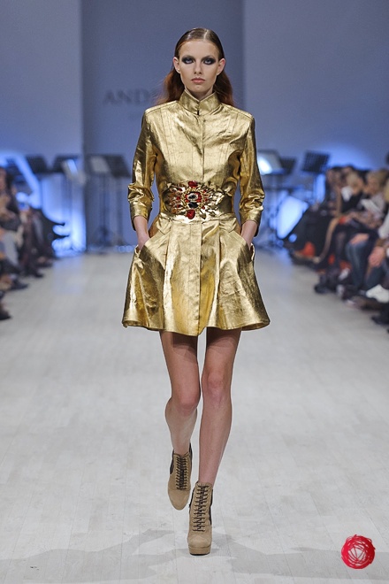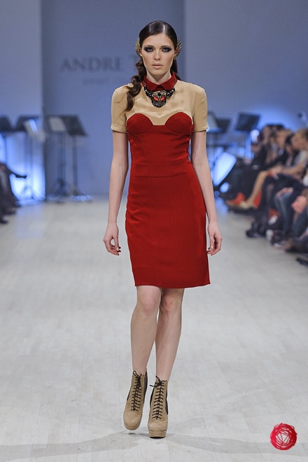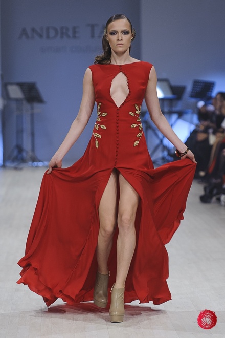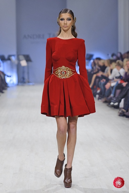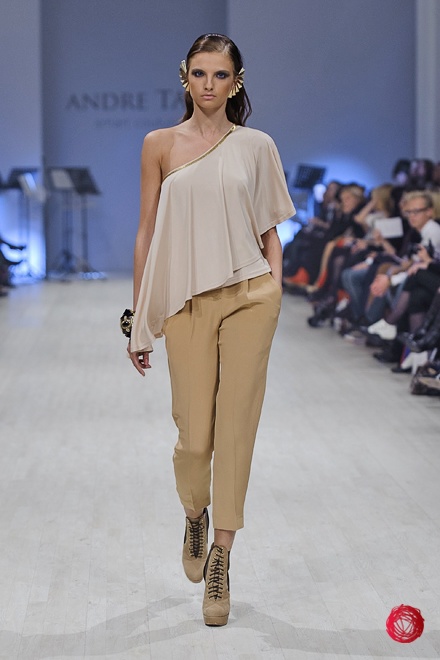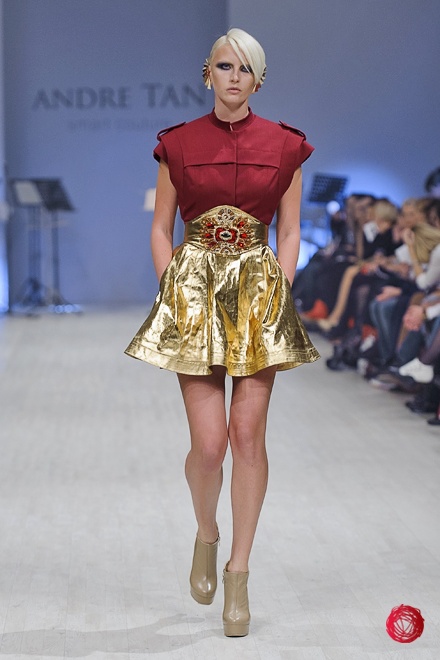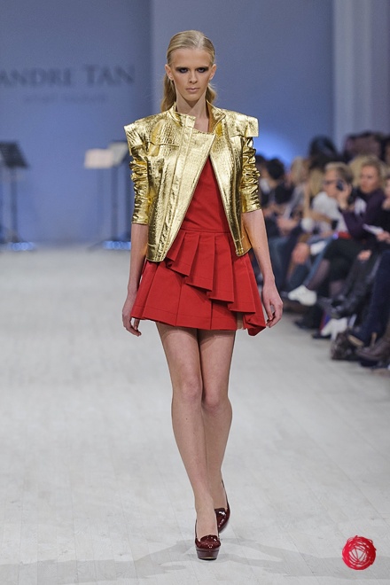 Андре Тан представил коллекцию «Восхождение на Олимп», в которой сделал основной акцент на роскоши и великолепии, что подтверждает использование алого и золотого цветов, крупных украшений и обуви популярного несколько сезонов назад бежевого цвета. Украинский дизайнер цитирует своих западных коллег, повально увлеченных стилем «барокко», но несколько переусердствовал с яркими и блестящими элементами, что делает наряды из коллекции подходящими разве что для посещения светских мероприятий.