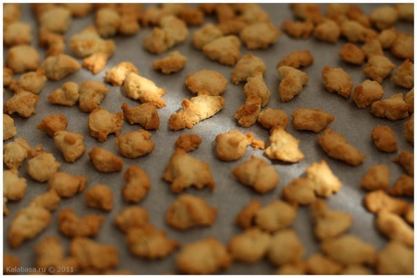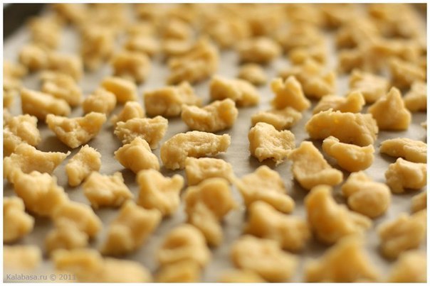 В классическом варианте тесто прокручивают через мясорубку и выкладывают небольшие его комочки на смазанный маслом противень. Если мясорубки нет, просто отщипывай небольшие шарики от теста и выкладывай их на противень (смазав его сливочным маслом или выложив бумагой для выпечки).