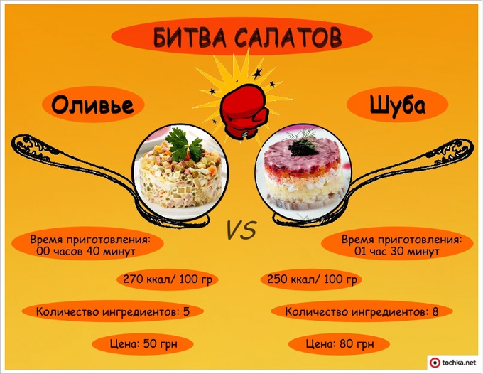 Не долго думая, кого выпустить на ринг, наша редакция остановилась на Оливье и Шубе - завсегдатаях домашних пиров и пьяных вечеринок. Вероятнее всего, ты уже даже пыталась найти новые рецепты этих вечных традиционных салатов. Действительно, их ведь еще никто не отменял.