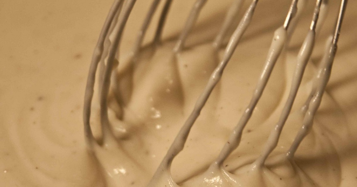- Тонкой струйкой вливать молоко в мучную смесь и тщательно перемешивать венчиком.