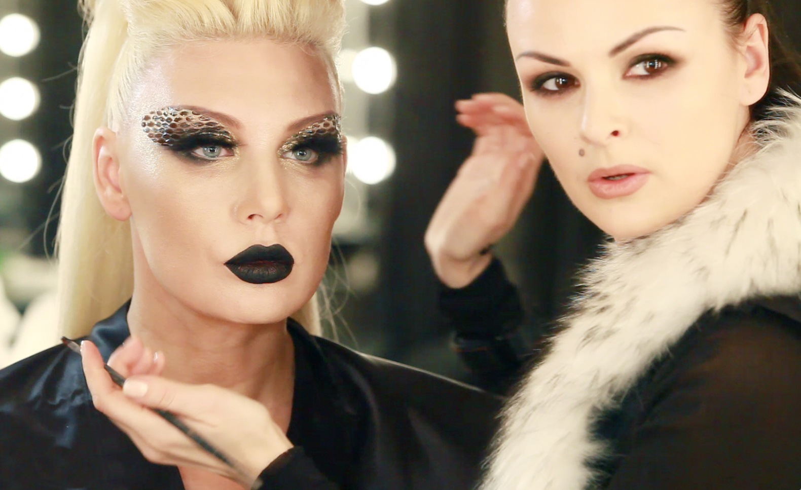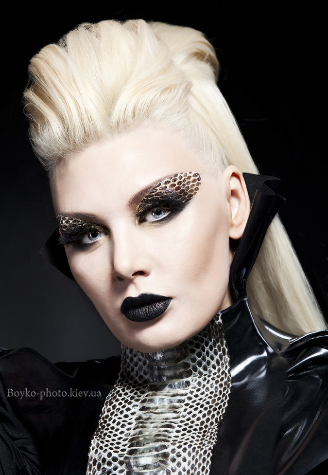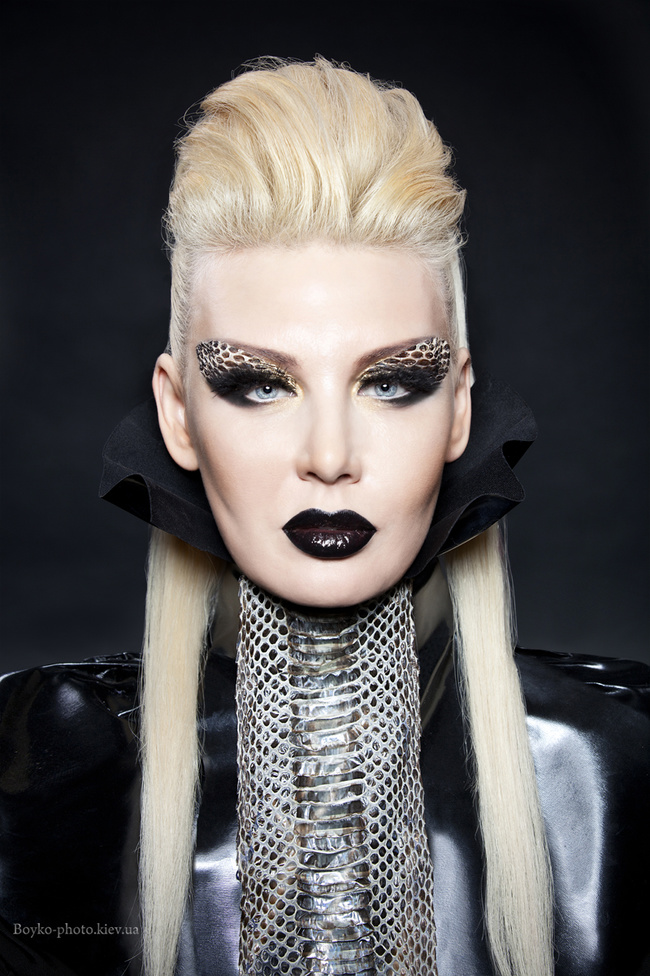 Татьяна Бойко рассказала, что у нее была идея создать изысканный, креативный, но в тоже время «хищный» макияж. Для этого Татьяна использовала кожу настоящего королевского питона и золотые тени. Образ дополнил высокий «змеиный ошейник», который визажист создала сама.
