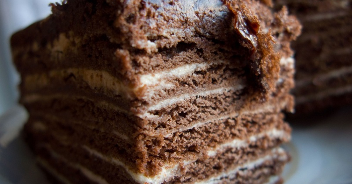 - Для приготовления теста мед, желток, масло, сахар, соду, погашенную уксусом и молоко нужно заварить на маленьком огне, а затем остудить. В эту массу добавить какао, муку, замесить тесто и испечь 6 коржей при температуре 150 градусов в течение 5 минут (коржи пекутся очень быстро).