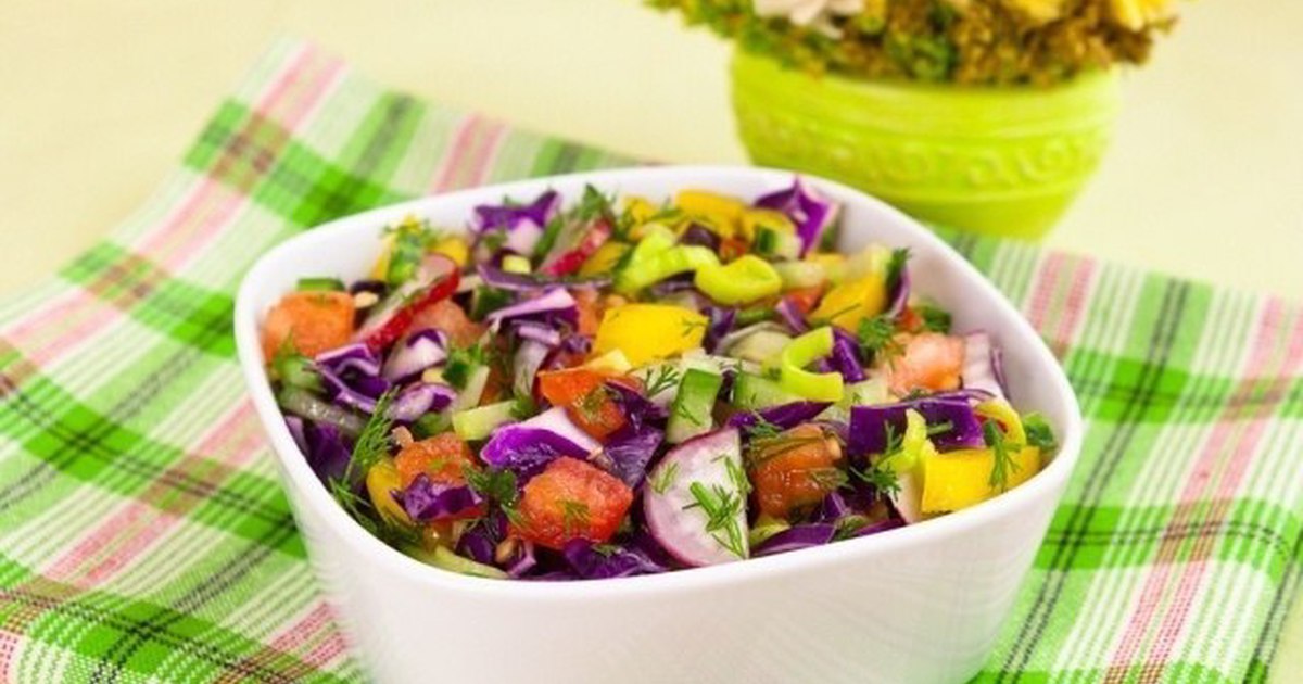 - Смешать капусту, редис, лук, огурцы, помидоры, зелень. Посолить. Заправить растительным маслом.