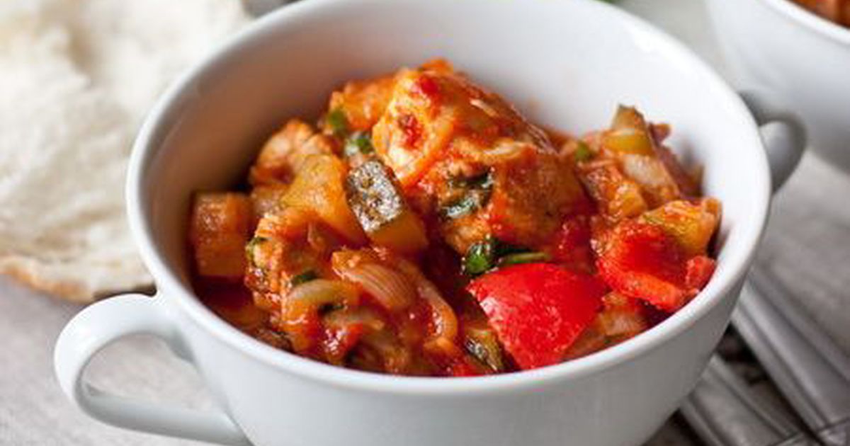 - Возвращаем в сотейник курицу, кладем размятые томаты вместе с соком. Солим по вкусу, перемешиваем, доводим до кипения и тушим 20 минут, до готовности овощей и курицы.