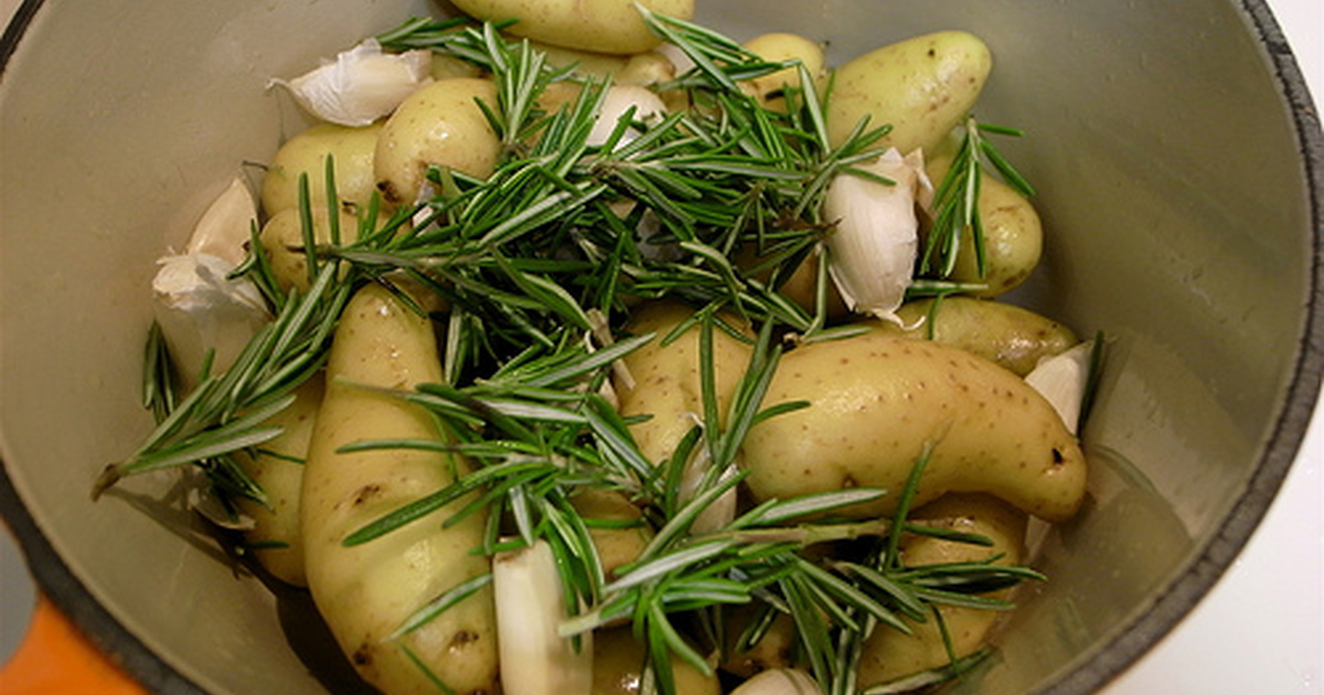- Посолить и поперчить по вкусу, добавить чеснок зубчиками и листья розмарина. Перемешать.