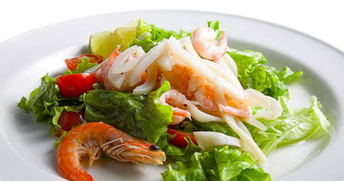- Выкладываем листья салата, вареные креветки, помидоры черри и яйца на тарелку, солим и добавляем лимонный сок.