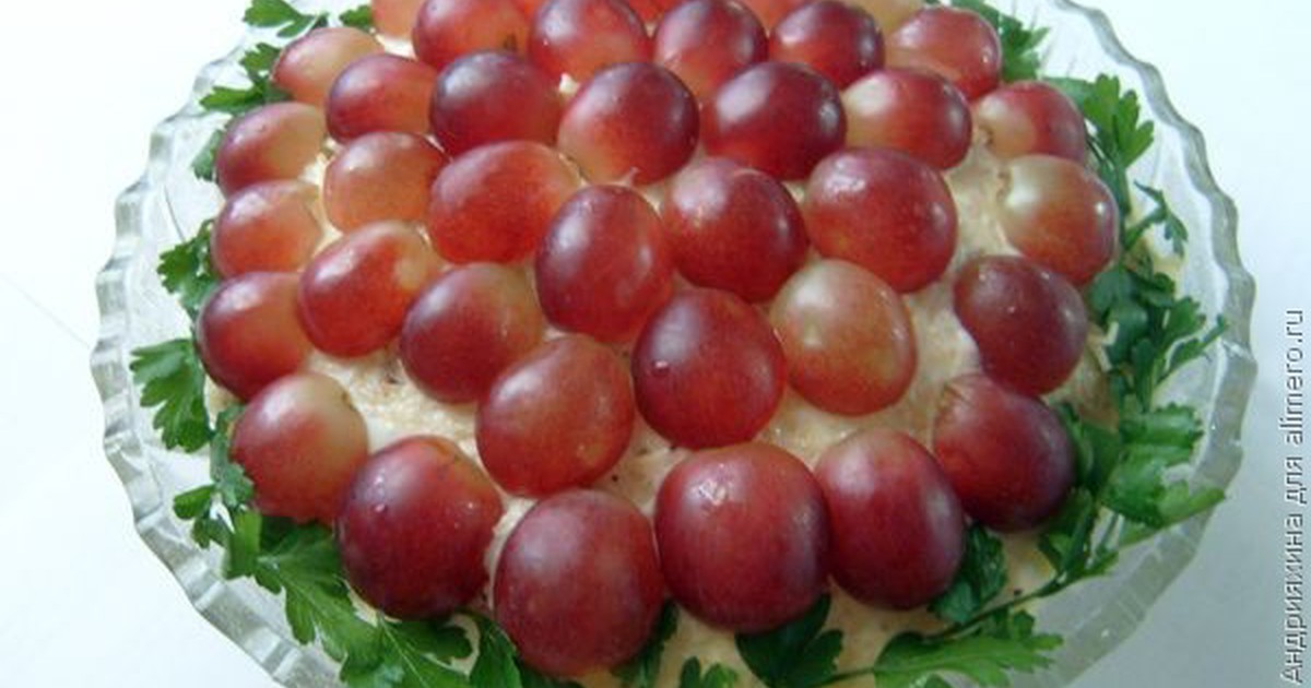 - В разных вариантах салата курица используется или копченая, или сырая, нарезанная мелкими кусочками и обжаренная с карри. Я облегчила себе процесс и взяла копченую. Мясо нарезаем мелкими кубиками.Каждый ингредиент будем делить пополам, чтобы можно было сделать нетолстые слои и повторить их. Первый слой – курица, смазанная майонезом.Яйца режем мелко ножом или с помощью яйцерезки – брусочками. Половина яиц идет на второй слой, также смазывается майонезом.Орехи можно брать любые: грецкие, миндаль, фундук. Я взяла вообще смесь и натерла на мелкой терке. Кто любит более выраженный вкус, может порубить орехи, чтоб частички были крупнее.Слой яиц посыпаем сверху ореховой стружкой. Сыр натираем на мелкой терке.Укладываем сырный слой и мажем майонезом, после чего все повторяем сначала.Виноград можно взять любого цвета, я предпочла более сладкий – красный, но можно взять и покислее – кто как любит. Разрезаем виноградины на две части, удаляем косточки и, начиная с центра салата, укладываем плотно по всей поверхности. Край салатника украшаем веточками петрушки.Слоеные салаты требуют пропитки, поэтому отправляем его постоять в холодильник, а потом лакомимся. Фруктовые нотки очень украшают восхитительный вкус этого салата.