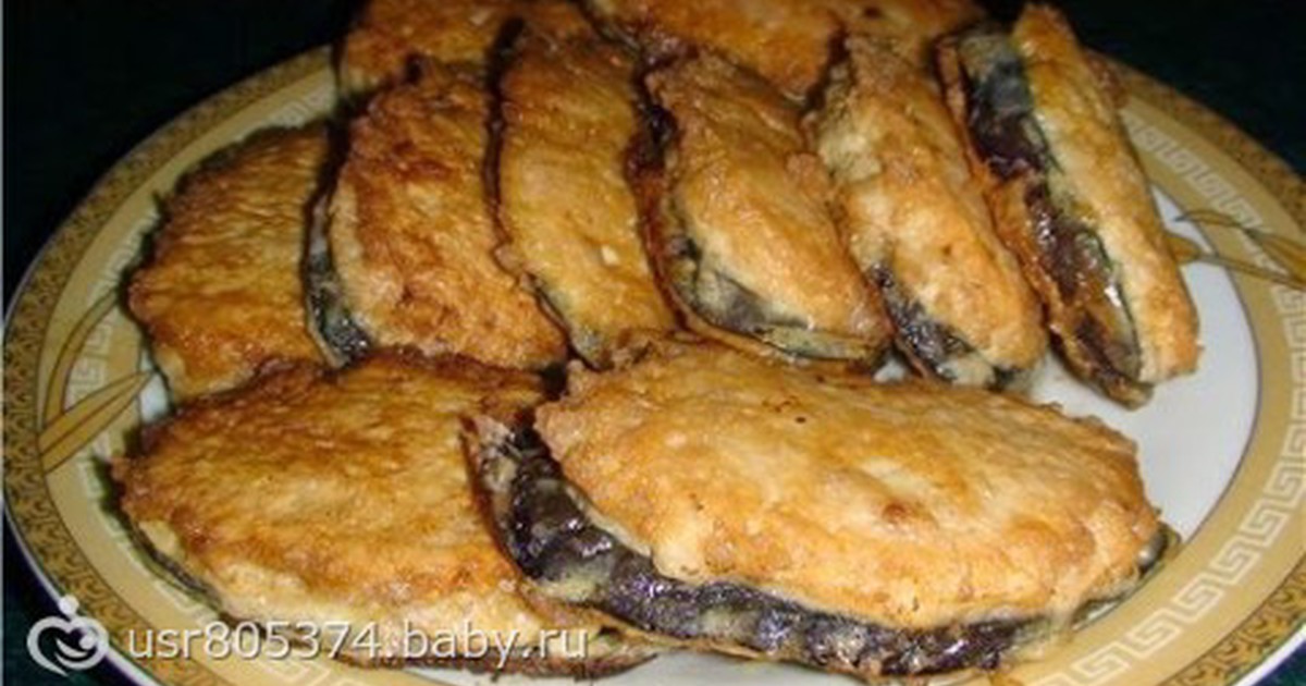 - 1.Нарезаем баклажаны (наискосок), делаем фарш, как на котлеты 2.На каждый блин из баклажана накладываем фарш, прижимаем и формируем лепешку 3.Обваливаем сначала в муке, а потом во взбитом и посоленном яйце, жарим сначала фаршем вниз