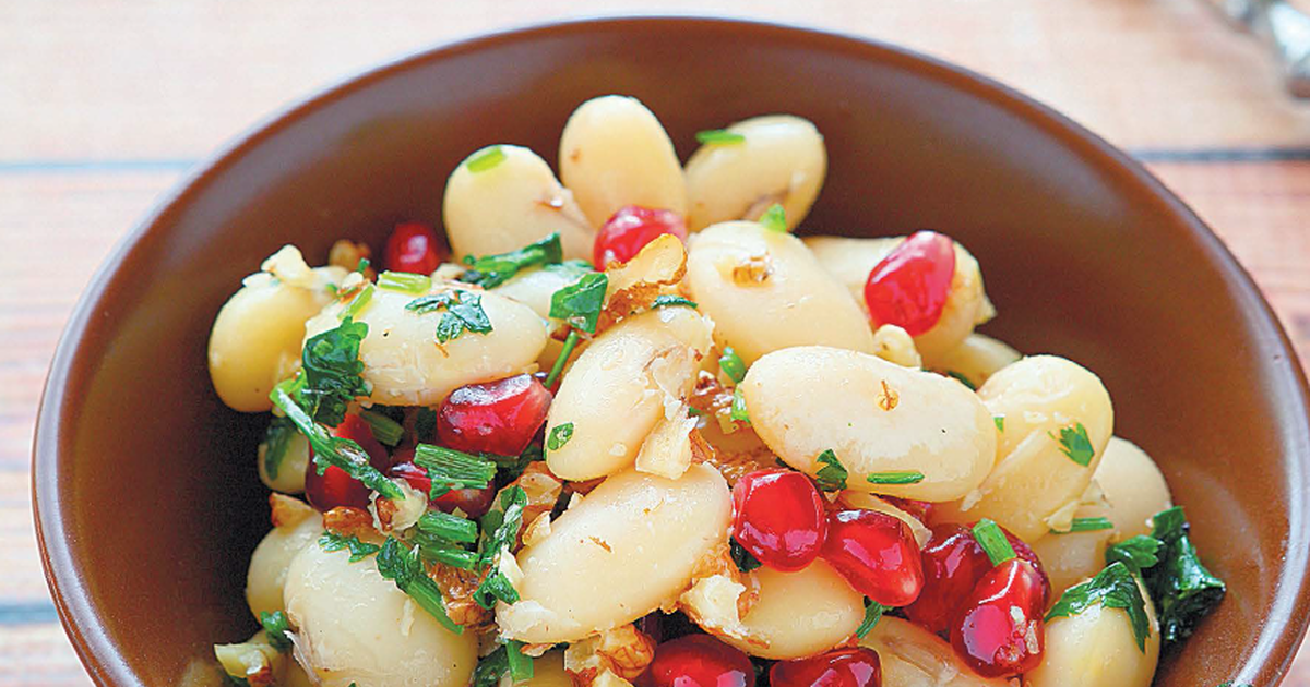 - Фасоль замочите на ночь, слейте воду. Варите в новой воде с лавровым листом и солью 1,5 часа. Измельченный лук жарьте 10 минут в масле, добавьте толченые грецкие орехи. Влейте 150 мл воды, приправьте солью и перцем. Тушите 20 минут. Добавьте толченый чеснок и мелко нарезанную кинзу. Соедините с фасолью и зернами граната. Перемешайте, дайте настояться 10 минут под крышкой.