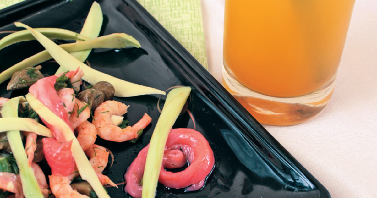 - Чеснок, каперсы, зелень укропа и лук измельчить, добавить вареные креветки и горчицу. Авокадо очистить, мякоть нарезать тонкими полосками, сбрызнуть лимонным соком. Рыбу нарезать кусочками. Подготовленные ингредиенты соединить. На десертное блюдо выложить салат и авокадо.