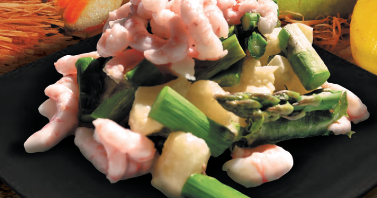 - Картофель нарезать кубиками, спаржу и лук-порей — небольшими кусочками, перемешать с картофелем и креветками. Салат посолить и заправить оливковым маслом.