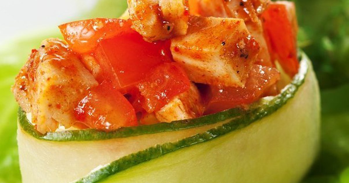 - Поджарить куриное филе на раст.масле, нарезать его маленькими кубиками. Помидор нарезать маленькими кубиками. Лук измельчить. Всё смешать с соусом, приправить по вкусу. Из огурца нарезать тонкие полоски, свернуть их, выложив начинку.