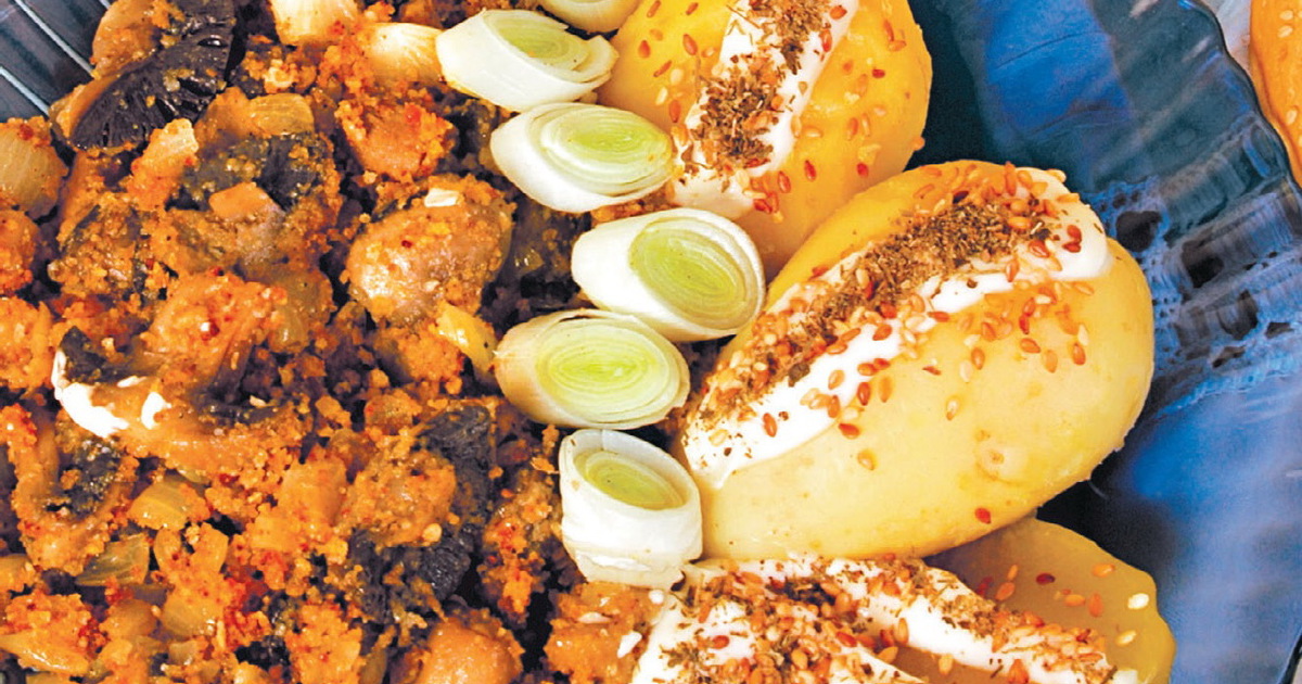 - 1. Свинину нарезать кубиками. 2. Грибы перебрать, очистить, промыть и нарезать ломтиками. 3. Репчатый лук очистить, вымыть, мелко нарезать. 4. Грибы смешать с мясом и луком, посолить, посыпать приправой, залить вином, оставить на 15 мин. 5. Картофель вымыть, очистить, залить водой, добавить лавровый лист, соль, варить 20 мин. 6. Лук-порей вымыть, нарезать кружочками. 7. Смесь грибов, мяса и лука выложить на сковороду с разогретым сливочным маслом, влить немного воды. Тушить в течение 20 мин на слабом огне. 8. Добавить томатную пасту, молотый шафран и тушить на слабом огне в течение 10–15 мин. 9. Готовое блюдо выложить в тарелку, посыпать кунжутом, украсить луком-пореем. Рядом выложить картофель, полить его майонезом, посыпать молотым перцем.