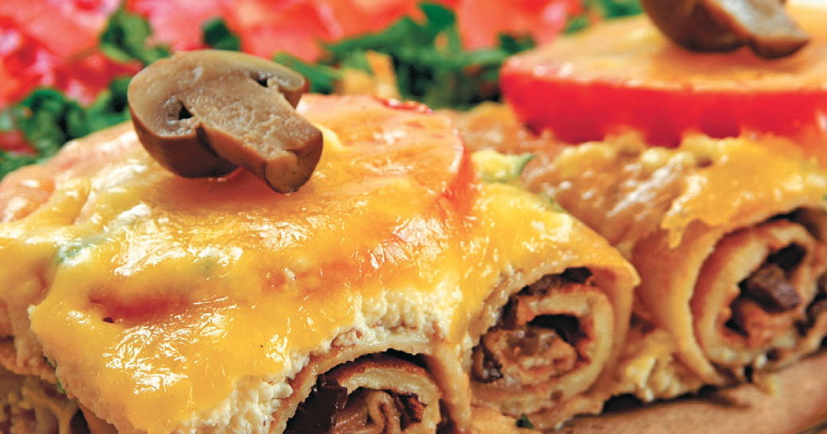 - 1. Смешать молоко, яйца, муку и соль. Взбить тесто и выпечь блины. 2. Лук и чеснок очистить и мелко нарезать. На сковороде разогреть масло и обжарить на нем лук и чеснок. 3. Грибы мелко нарезать и добавить к луку. Приправить солью и перцем и жарить до готовности. 4. На каждый блин выложить начинку. Свернуть блины в рулеты. 5. Помидоры вымыть и нарезать кружочками. 6. Творог растереть с желтками. Добавить зелень, соль, перец. 7. Сыр натереть на крупной терке. 8. Рулеты выложить в смазанную маслом форму. Сверху — слой творога, кружочки помидоров, сыр. Запекать до готовности.