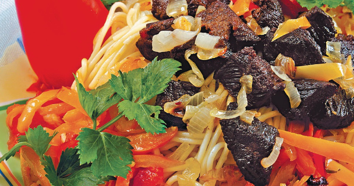 - 1. Мякоть баранины нарезать небольшими брусочками. 2. На сковороде нагреть масло и обжарить в нем кусочки баранины в течение 20 мин. 3. Репчатый лук очистить и мелко нарезать. Помидор вымыть и нарезать тонкими ломтиками. Редьку очистить и мелко нарезать. 4. Из перца удалить семена, мякоть нарезать соломкой. 5. Овощи поочередно обжарить в масле. Затем соединить вместе. 6. Чеснок очистить и измельчить, добавить к овощам вместе с уксусом и специями. 7. Спагетти отварить, откинуть на дуршлаг. 8. Перемешать спагетти с обжаренными овощами и мясом и охладить.
