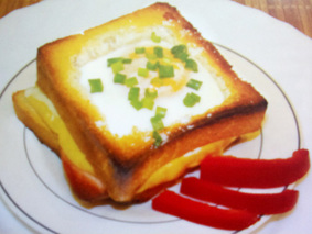 - Колбасу, сыр нарезать тонкими полосками. Помидор нарезать кружочками. На ломтик белого хлеба намазать майонез, положить колбасу, сыр, помидор. С другого ломтика хлеба сделать бортик, вырезав мякиш с середины. Положить бортик на наш первый бутерброд, и в серединку аккуратно выбить яйцо. Посолить. Так же приготовить остальные бутерброды. В разогретую до 160 градусов духовку поставить бутерброды, накрыть фольгой, запекать 15-20 мин. Готовые бутерброды посыпать мелко нарезанным луком.