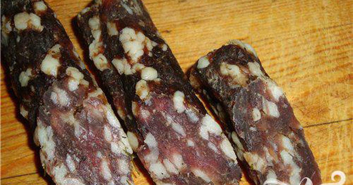 - Сало натереть смесью соли и чеснока, уложить в контейнер Мясо и сало промыть и обсушить тканевым полотенцем. Нарезать ломтиками не больше 1 см. толщиной, уложить в миску, посолить 1 ст.л с горкой крупной солью, перец черный молотый, "на глазок", 1 ст. л. сахара, 2 ст. л. водки, все перемешать, переложить в контейнер. Убрать мясо и сало в холодильник на сутки. Через сутки достать мясо, обсушить очень хорошо бумажным полотенцем, лишняя влага не даст склеиться фаршу. Мясо пропустить через мясорубку, через самую крупную решетку. Всего получится столько: Тщательно очистить с сала оставшуюся соль и чеснок, обсушить салфеткой. Сало через мясорубку не пропускаем, потому как этот процесс очень осалит фарш. Поэтому сало режем очень мелко. Сделать это удобнее, если сало чуть подморожено, кубики должны быть не более 5х5 мм. Мясо и сало уложить в большую ёмкость, добавить 2 ст. л. крупной соли, 1 ст. л. сахара, 50 мл. водки. Перемешать без фанатизма, сильно руками не мять. Получится вот что: Взять коврик для приготовления суши. Выстелить марлей. Выложить ложкой полученный фарш и сформировать колбаски Всего получится 7 шт. Всю эту красоту на застекленную лоджию, на сквозняк, и с вентилятором. Через пару дней подвялится Результат такой: