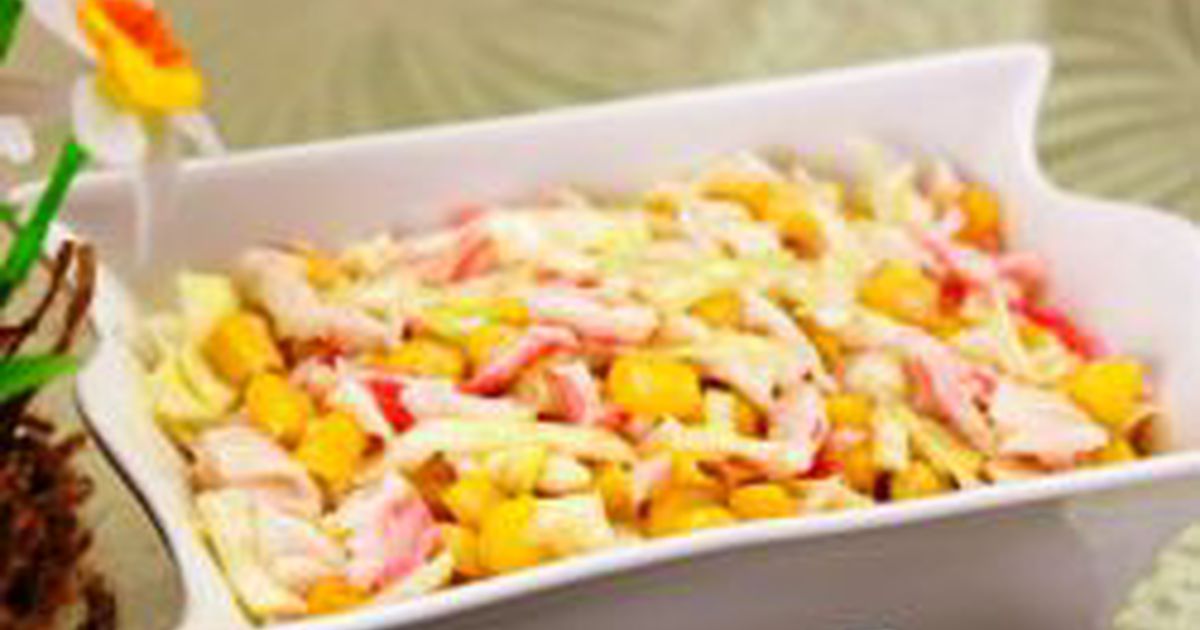 - Крабовые палочки достаем из упаковки и меленько нарезаем ножом. Капусту шинкуем соломкой, поливаем соком лимона и перемешиваем. Затем выкладываем все в миску, высыпаем консервированную кукурузу без сока и перемешиваем. Заправляем салатик нежирным майонезом и подаем к столу.
