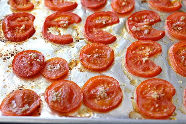 Духовку нагрій до 230 градусів. Лист застели фольгою. Наріж помідори і виклади їх на фольгу. У мисочці збий оливкову олію, часник, сіль, перець і цукор. Збризни цією сумішшю помідори. Запікай протягом 20-25 хвилин.