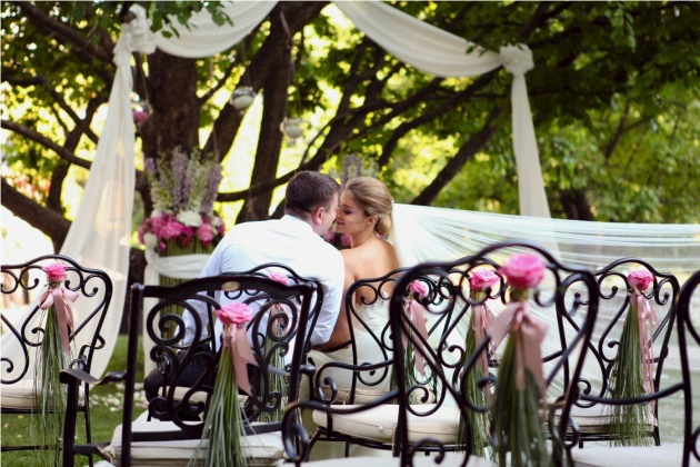 Виїзна церемонія проходила просто неба. Оригінальною альтернативою класичній весільній арці стали квіткові композиції казкової краси та летючі тканини, що майоріли під подувом навіть найменшого вітерця. Стільці для відвідувачів були прикрашені квітами і стрічками, а доріжка до місця церемонії усипана пелюстками троянд.