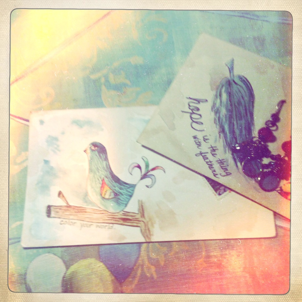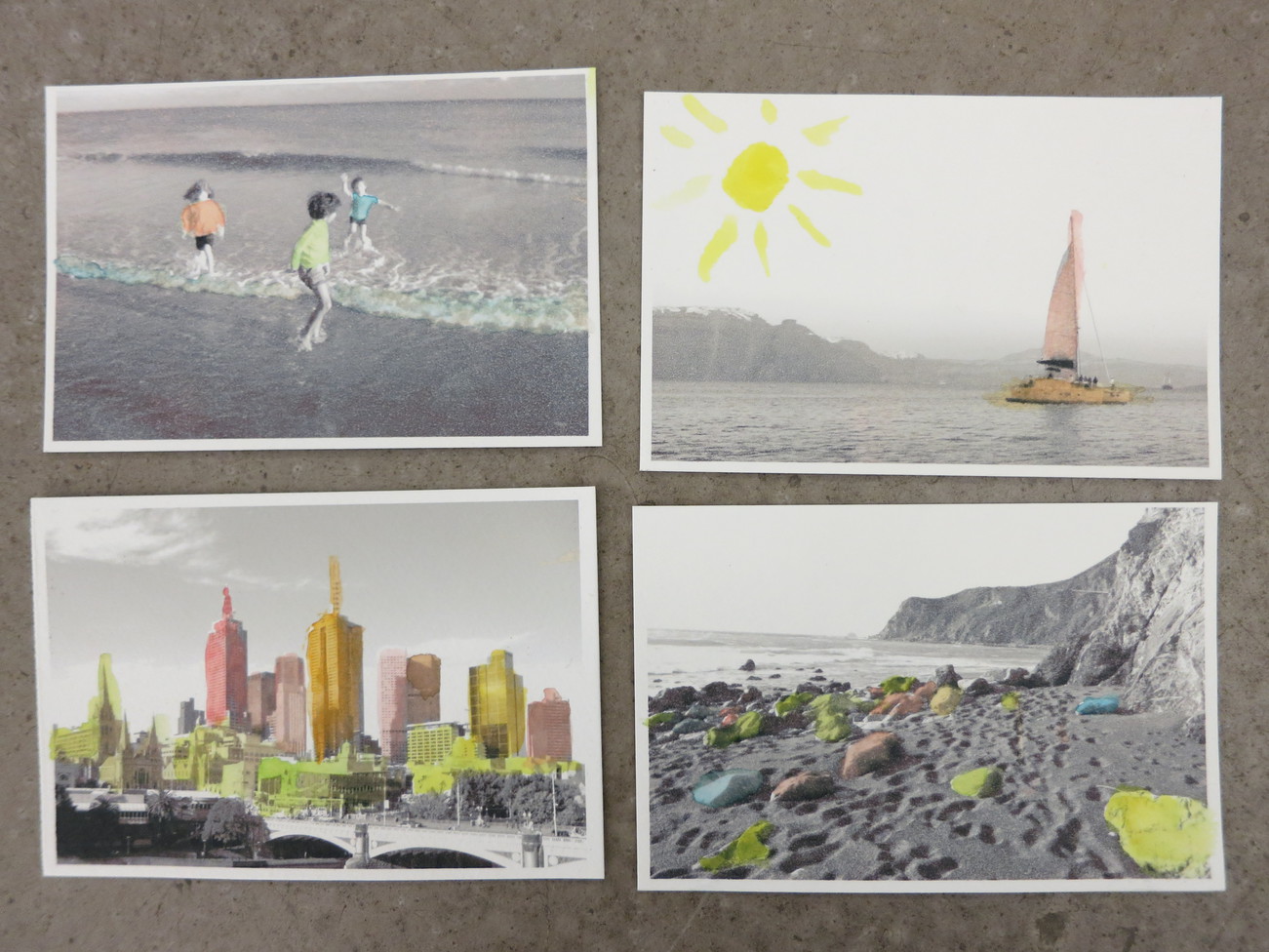Можеш роздрукувати на тонкому папері різні картинки і приклеїти їх на більш тверду основу. А чорно-білий малюнок розмалювати аквареллю.