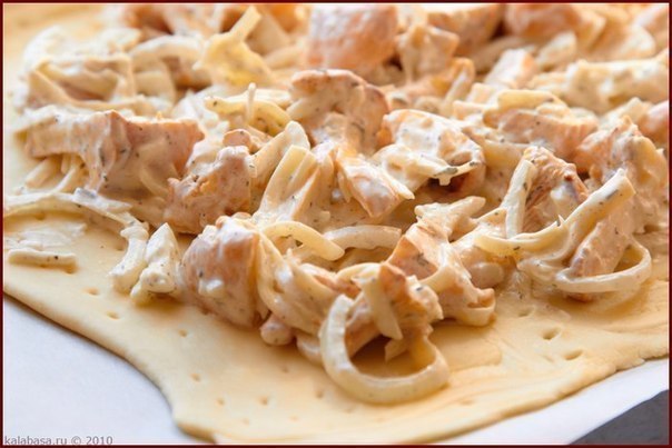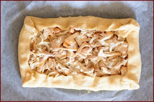 Сюди додай сметану, тертий сир, чебрець, сіль, перець. Добре перемішай і виклади на тісто, залишивши по краях по 2-3 см.