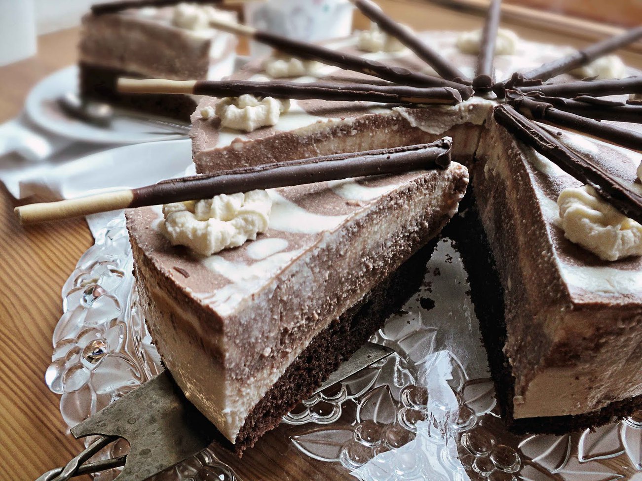 Постав торт на ніч у холодильник. Перед подачею прикрась розетками зі збитих вершків і хрусткої соломкою, покритою шоколадом.