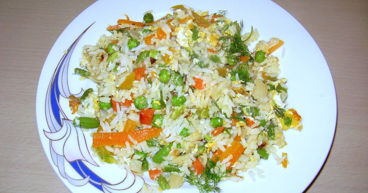 - Яйцо разбейте в мисочку и взбейте вилкой, затем влейте в сковороду с рисом.