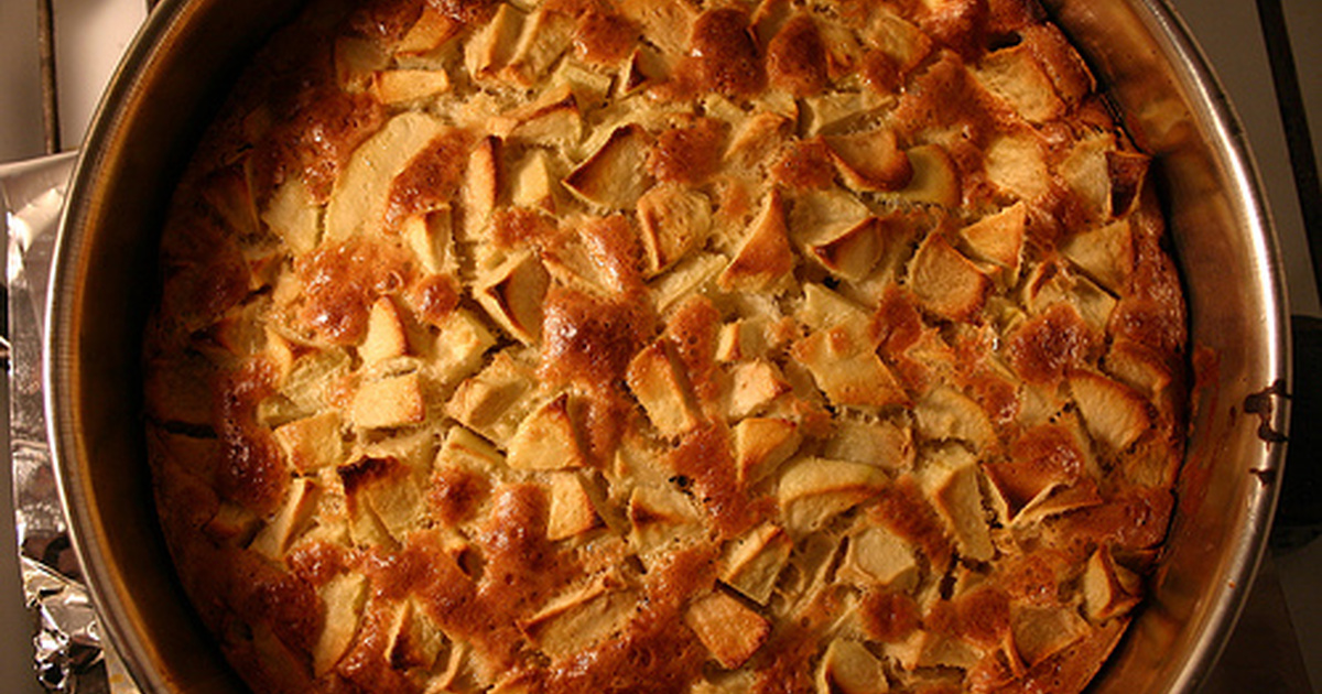 - Уложите сверху яблоки и залейте оставшимся тестом.