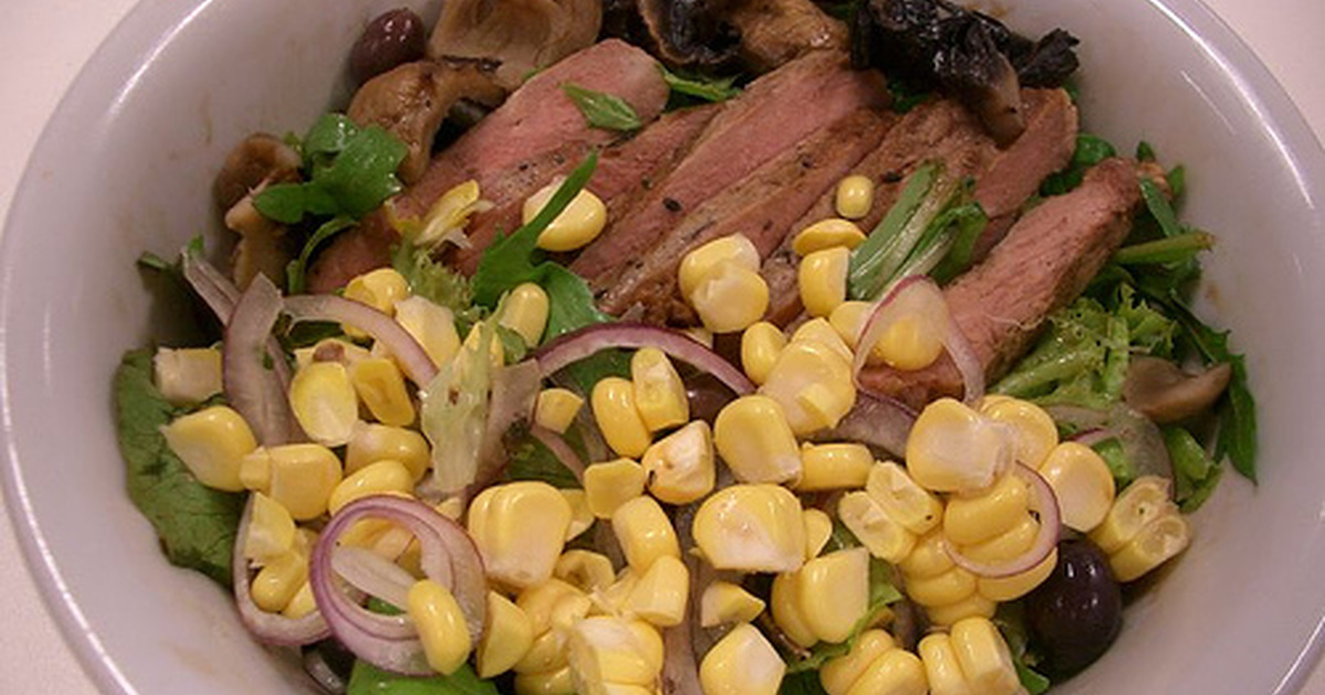 - Сверху добавить в салат кукурузу, заправить бальзамическим уксусом и оливковым маслом. Посолить и поперчить.