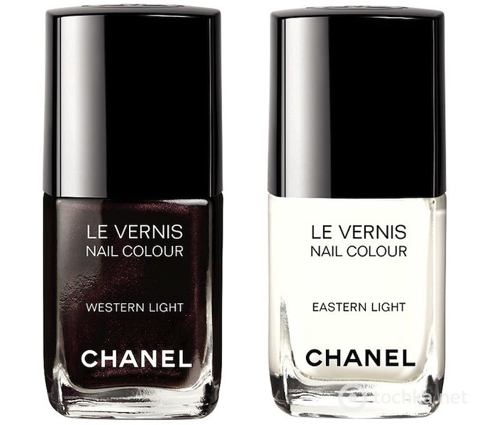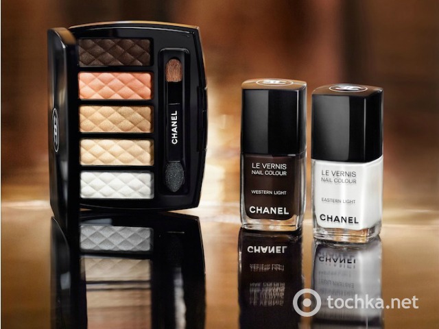 Колекція дійсно вийшла дуже лаконічна. До неї увійшло лише три продукти: п'ятикольорова палетка тіней Pearl River, де перламутрові персикові і золотисті відтінки поруч з радикальним чорним шоколадом. І два лаку для нігтів: Estern Light (білий) і Western Night (шоколадний).