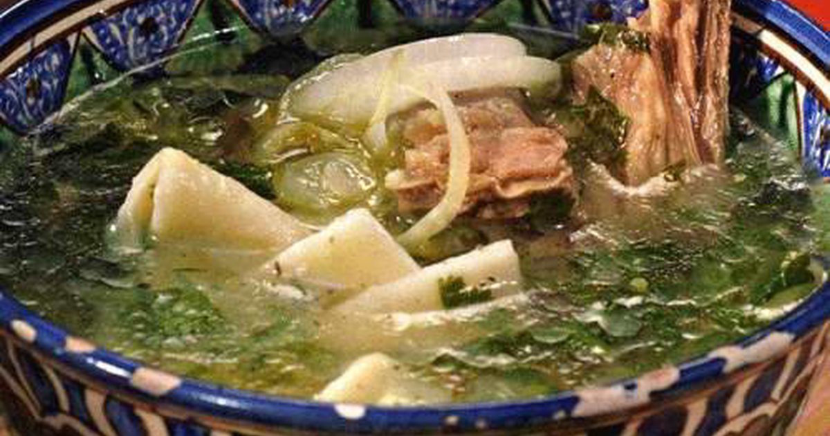 - 5. Слегка подсушенные лепешки нарезаем примерно на 4 части и бросаем в кипящий бульон, аккуратно помешивая. Одновременно ставим на огонь порезанное мясо (в чашку добавляем немного бульона), лук с картошкой (так же добавляем бульон)и как только закипят кастрюли, выключаем огонь. Лепешки сваренные в течении 5-10 мин. (в зависимости от толщины), достаем дуршлаком, выкладываем в большое плоское блюдо, затем мясо и лук с картошкой. Украшаем зеленью.