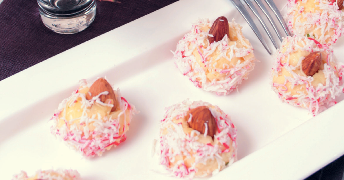- Сыр натереть на терке, чеснок измельчить, добавить майонез и сформовать небольшие шарики. Крабовое мясо натереть на мелкой терке. В середину каждого сырного шарика положить миндальный орех, посыпать тертым крабовым мясом.