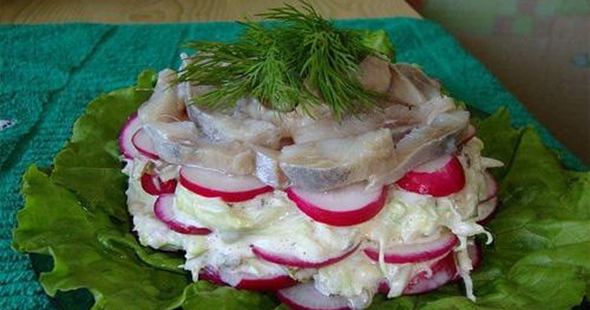- На лист салата выкладываем слоями: редис, соус (пекинская капуста, сол.огурец на терке, чеснок, майонез), редис, соус, селедка