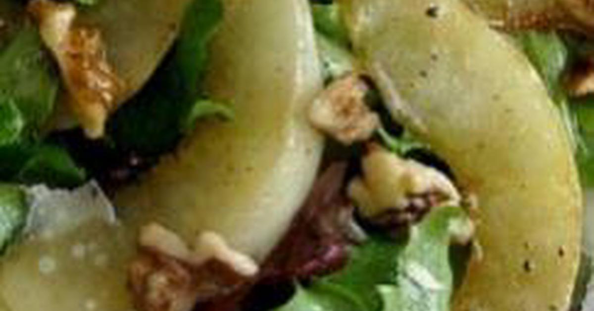- 1. Кресс-салат и рукколу вымыть, обсушить, перемешать и разложить по тарелкам. 2. Груши вымыть, нарезать тонкими ломтиками и сразу же сбрызнуть их соком лимона (чтобы не потемнели). Ломтики груши выложить поверх листьев салата. 3. Каждый финик разрезать пополам, вложить внутрь половинку грецкого ореха и положить их между ломтиками груш. 4. Оливковое масло смешать с уксусом и полить этой заправкой салат. Пармезан нарезать тонкой длинной соломкой или (при помощи овощечистки) тонкими пластинками. Готовый салат посыпать сыром и сразу же подавать.