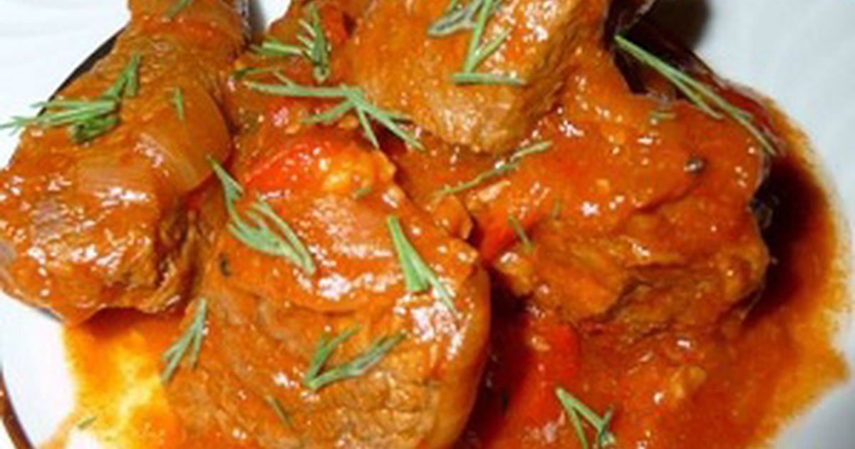 - Очищаем мясо от пленок и хорошо его вымоем. Обсушим полотенцем и нарежем кубиками стороной в 3 см. Очистим лук и измельчим его острым ножом. Наливаем в сковородку масло и после его разогревания отправим в него кубики мяса и лук. Чтобы прибавить мясу нежность и мягкость, рекомендуем мясо поспать пищевой содой! Доливаем 0,5 стакана воды, перчим и солим по своему вкусу. Готовим блюдо на минимальном огне, не закрывая сковороду крышкой. Когда пена перестанет образовываться, можно сковороду нарыть крышкой. Готовим блюдо приблизительно 2 часа на минимальном огне. По истечении 2 часов придадим нашему блюду кисло-сладкий вкус. Добавляем сахар и зальем блюдо томатной пастой, которую мы предварительно разведем со 100 мл воды. Перемешаем и продолжим готовить еще 20 минут. И вот сейчас наше вкуснейшее блюдо уже готово