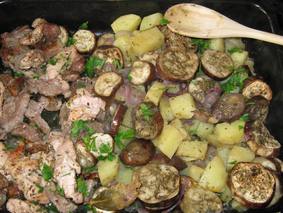 Баклажаны запеченные с индейкой и картофелем