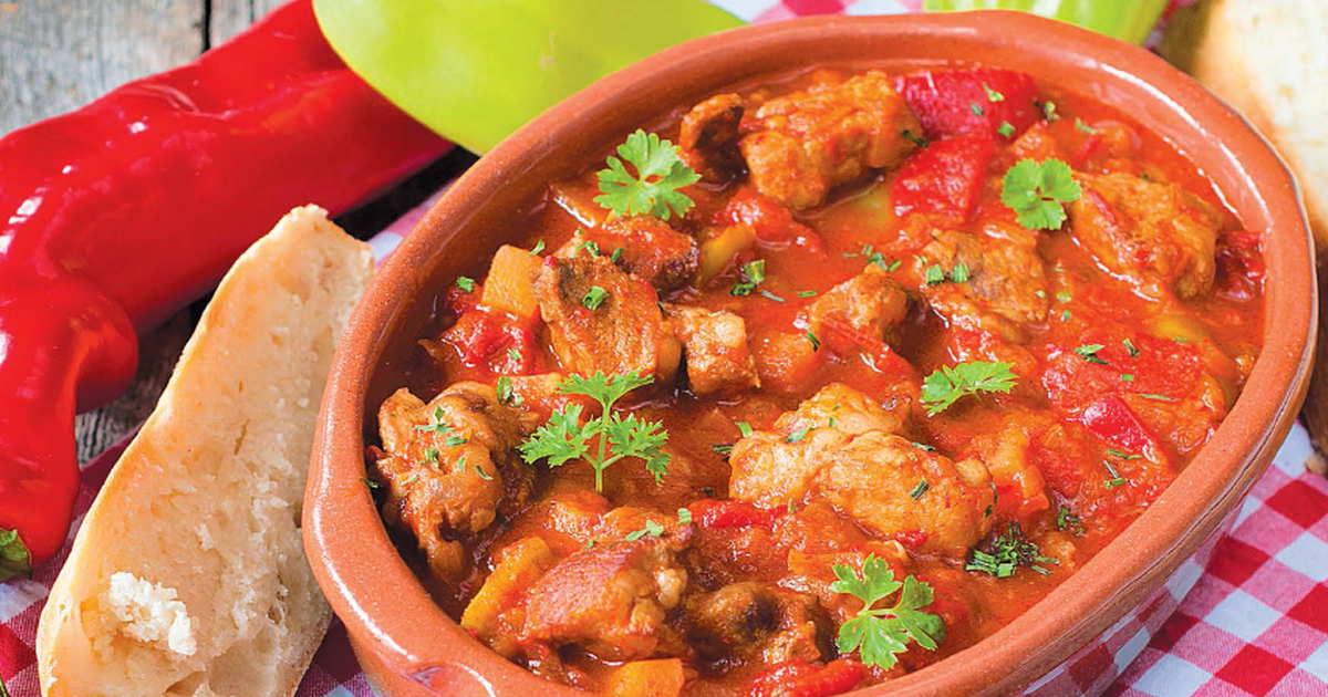- Говядину нарежьте небольшими кубиками. Растопите в глубокой сковороде сало, обжарьте в нем кубики мяса. Через 5 минут добавьте измельченный лук, тертую морковь и протертые через сито помидоры. Готовьте 5 минут, помешивая. Переложите в глиняные формы. Болгарский перец без семян нарежьте полосками, картофель — кубиками. Добавьте к мясу вместе с толченым чесноком, паприкой и перцем. Посолите по вкусу. Влейте вино, добавьте воду, чтобы та покрыла содержимое форм. Готовьте в духовке под крышками при 200 градусов C 40 минут. Посыпьте готовое блюдо измельченной зеленью петрушки.