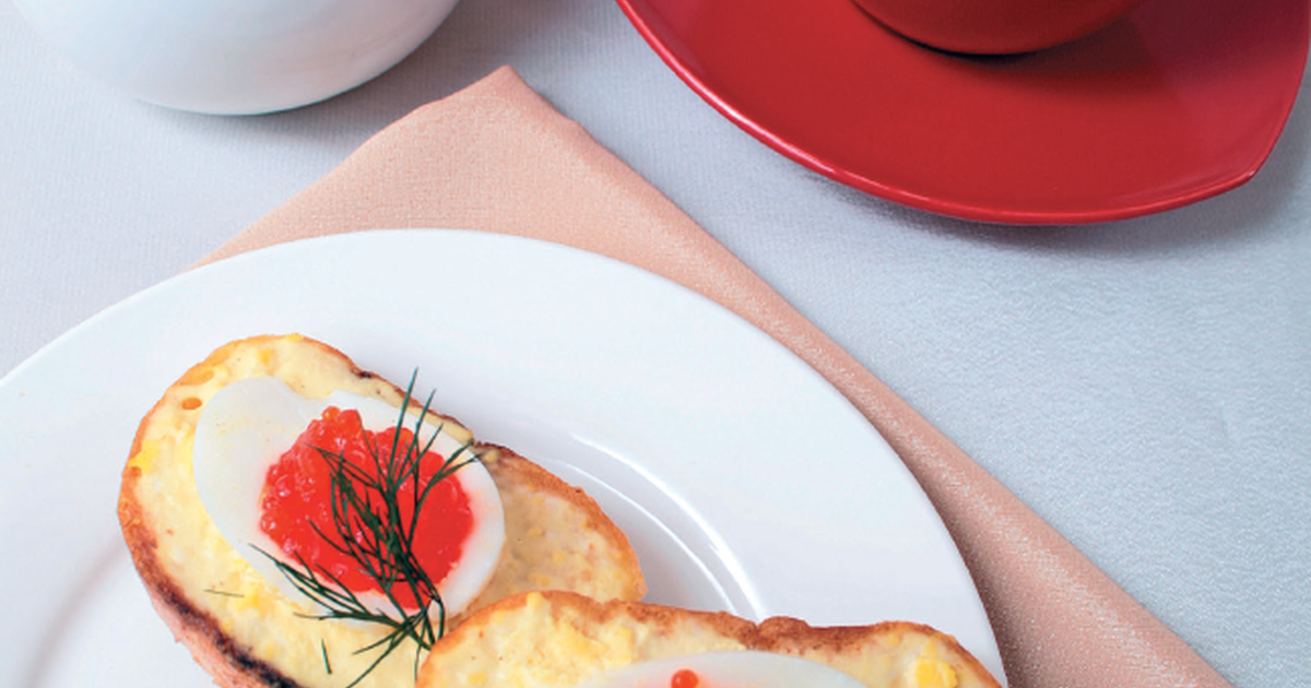 - Яйца сварить и удалить желток. Вилкой размять желток и перемешать с маслом. Полученную массу намазать на гренки из белого хлеба, сверху положить кольца яичного белка, а в середину уложить горкой икру.