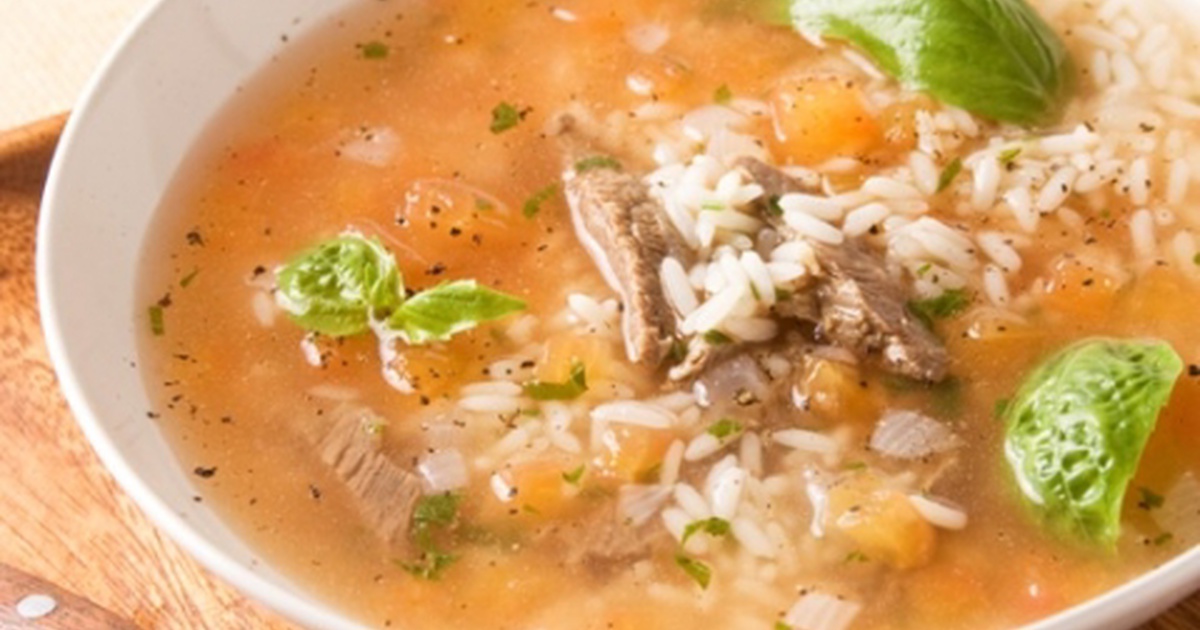 - Бараньи кости варите 10 минут в большом количестве воды, затем выньте из бульона и ополосните холодной водой. Мясо вместе с костями залейте свежей водой, доведите ее до кипения и, сняв пену, варите на слабом огне полтора часа. За полчаса до окончания варки кости удалите. Вареное мясо выньте из бульона и нарежьте брусочками. Положите в бульон рис и варите суп на слабом огне 10 минут. Помидоры, сняв кожицу и удалив семена, измельчите, лук порубите. Положите овощи в суп, добавьте соль, перец, сахар, мускатный орех и варите еще 10 минут. Затем положите мясо, базилик и доведите суп до кипения.