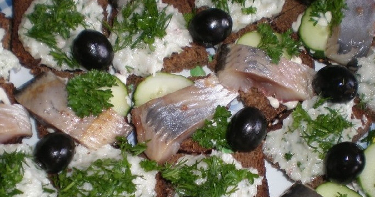 - Подготовим все, что нам потребуется для приготовления бутербродов. Сало необходимо пропустить через мясорубку вместе с чесноком. Затем в смесь добавить мелко нарубленный укроп. Хлеб нарезаем ломтиками, затем каждый ломтик делим на 4 части. Половину (под селедку) смазываем майонезом, кусочки под сало - оставляем нетронутыми. На хлеб без майонеза намазываем смесь из сала и чеснока, на хлеб с майонезом выкладываем огурчики и кусочек селедки и веточку укропа. Складываем в шахматном порядке на тарелке бутерброды, украшаем маслинами.