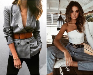 - Ремень. В этом году модно будет носить широкий кожаный ремень с эмблемой. Такой ремень лучше носить с туниками, свитерным платьем, длинной рубашкой или скинни джинсами с высокой посадкой.