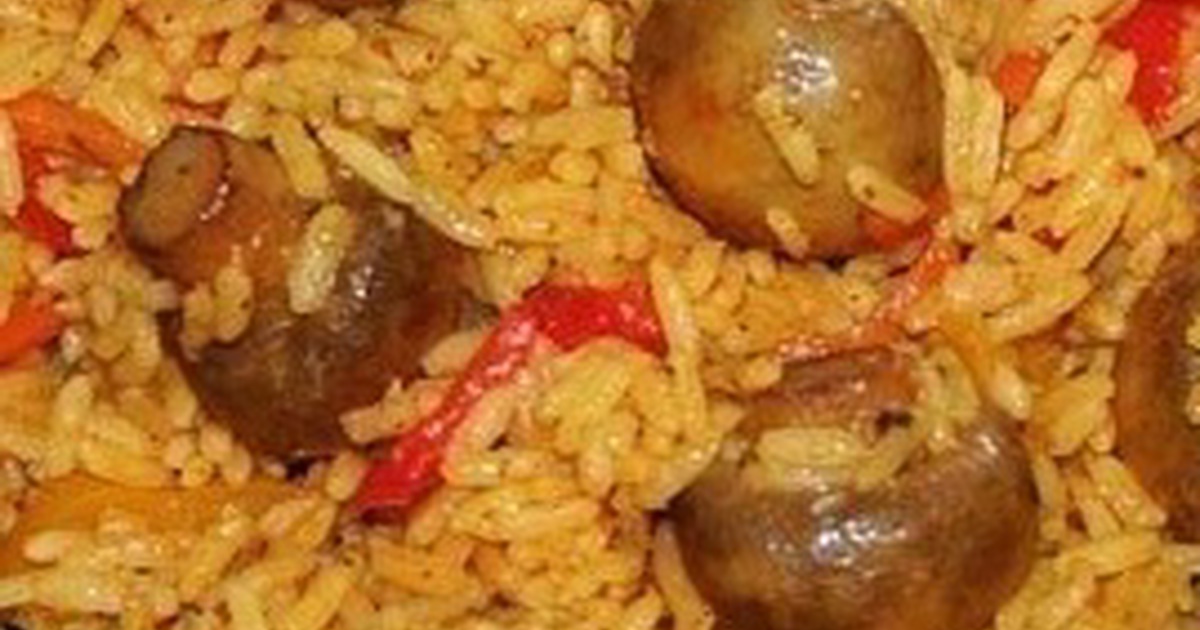 - Грибы промыть и хорошо обсушить. Хорошо разогреть масло в воке или казане и отправить туда грибы. Обжарить их на сильном огне. Затем добавить лук, порезанный полукольцами; постоянно помешивая, жарить ещё минуты 3-4, потом убавить огонь на минимум и, накрыв крышкой, тушить минут 15 (иногда помешивая). После добавить нашинкованную морковь и, увеличив огонь, постоянно помешивая, готовить ещё минут 5-7. От красного и жёлтого болгарского перца взять только по половине, в принципе можно просто один перец любого цвета. Перец нашинковать, отправить в сковородку и потушить ещё минут 5, посолить, добавить по 1/3 чайной ложки куркумы, паприки, базилика, майорана. Затем насыпать половину риса, опять посолить и добавить часть специй, сверху вторую половину риса и оставшуюся часть специй. Опять посолить, положить по средине чеснок, срезав у него нижнюю часть. Залить все это кипятком, чтобы вода была выше примерно на 1 см от риса и готовить на самом медленном огне под крышкой минут 30.